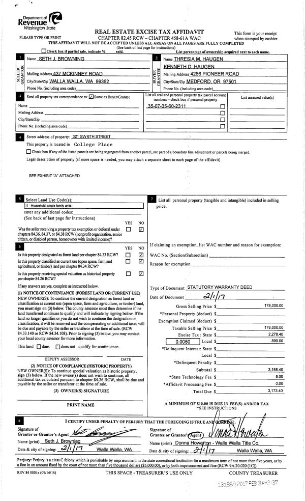 | 1 | 02/03/2017 | SWD | STATUTORY WARRANTY DEED | BROWNING SETH J | HAUGEN KENNETH D & THRESIA M | | | $178,000.00 | 131869 | 2017-00956 |
