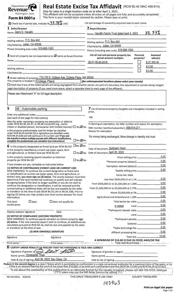 | 6 | 05/18/2022 | QCD | QUIT CLAIM DEED | HANAFIN GARRY D | HANAFIN FAMILY TRUST | | | | 143963 | 2022-04233 |