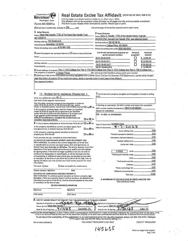 | 5 | 04/13/2023 | QCD | QUIT CLAIM DEED | HANAFIN GARRY DOUGLAS ET AL | HANAFIN FAMILY TRUST ET AL | | | | 145655 | 2023-01942 |