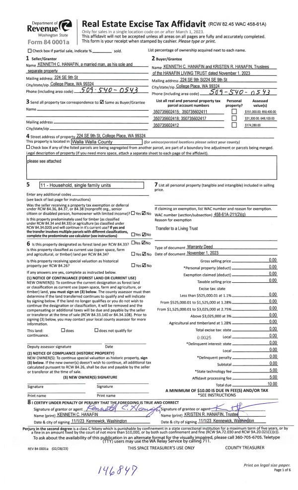 | 2 | 11/27/2023 | WARRANTY D | WARRANTY DEED | HANAFIN FAMILY TRUST ET AL | HANAFIN LIVING TRUST | | | | 146847 | 2023-06855 |