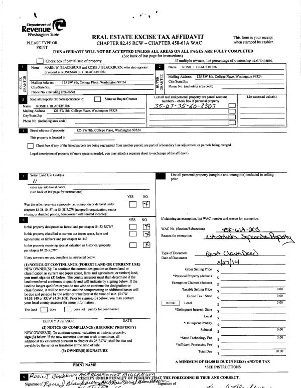 | 1 | 04/16/2014 | QCD | QUIT CLAIM DEED | BLACKBURN MARK & ROSE | BLACKBURN ROSIE J | | | | 125730 | 2014-02584 |