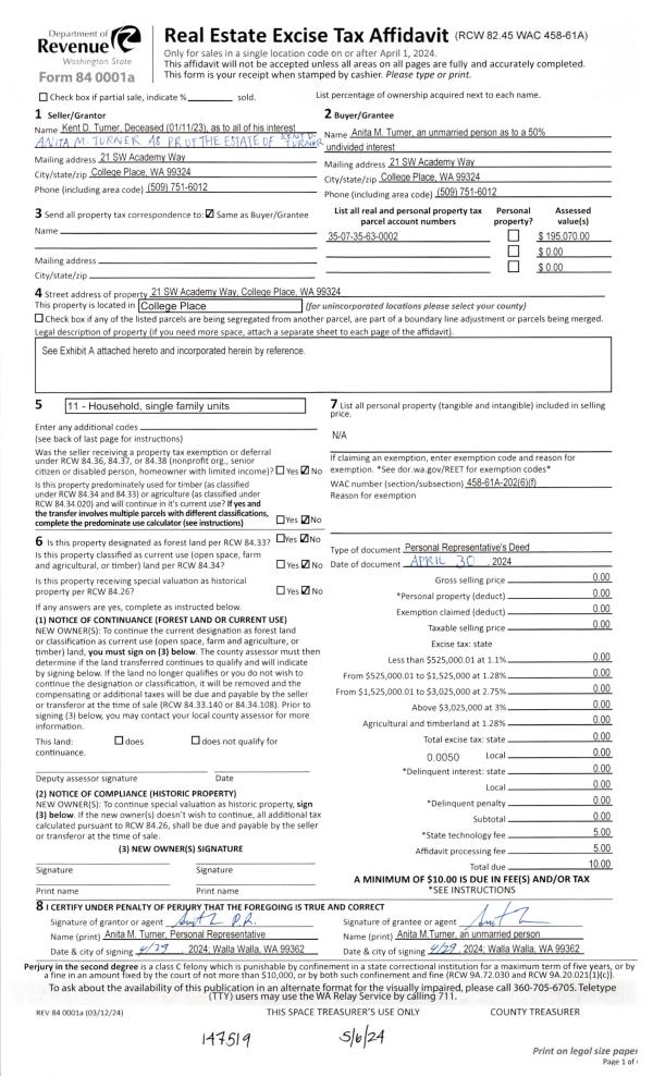 | 1 | 08/09/2024 | DPR | DEED OF PERSONAL REPRESENTATIVE | TURNER KENT D & ANITA M | TURNER ANITA M | | | | 147519 | 2024-02370 |