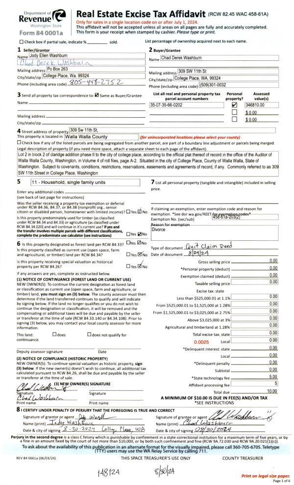 | 1 | 09/05/2024 | QCD | QUIT CLAIM DEED | WASHBURN CHAD DEREK & JODY ELLEN | WASHBURN CHAD DEREK | | | | 148124 | 2024-05021 |