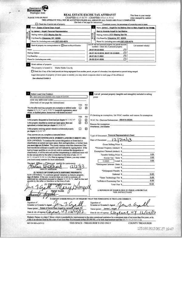 | 2 | 08/07/2014 | DPR | DEED OF PERSONAL REPRESENTATIVE | ANGELL DARREL DEAN | ANGELL JAMES L AND JAMES L & MARY ANGELL AND | | | | 125180 | 2013-12297 |