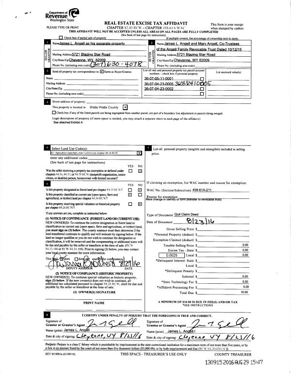 | 1 | 08/29/2016 | QCD | QUIT CLAIM DEED | ANGELL JAMES L AND JAMES L & MARY ANGELL LIFE ESTATE & AMANDA ANGELL | ANGELL FAMILY REVOCABLE TRUST | | | | 130915 | 2016-06927 |