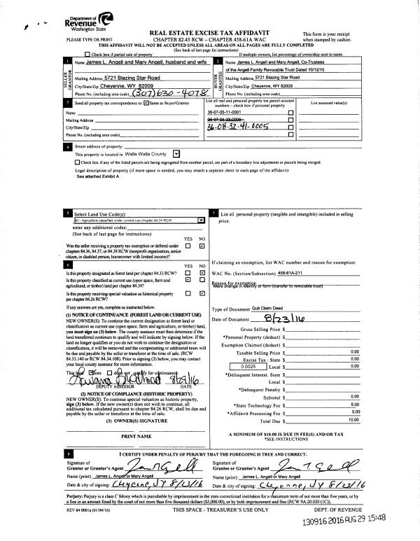 | 2 | 08/29/2016 | QCD | QUIT CLAIM DEED | | ANGELL FAMILY REVOCABLE TRUST | | | | 130916 | 2016-06926 |