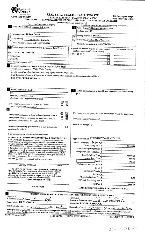 | 2 | 01/31/2014 | SWD | STATUTORY WARRANTY DEED | BAKLAND DEBRA KAY | PADDOCK ROGER E & KATHLEEN C | | | $78,000.00 | 125367 | 2014-00812 |