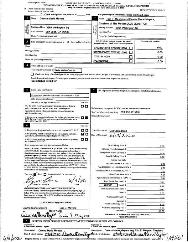 | 1 | 06/11/2020 | QCD | QUIT CLAIM DEED | MEYERS DAWNA MARIE | MEYERS 2020 LIVING TRUST | | | $0.00 | 139261 | 2020-05244 |