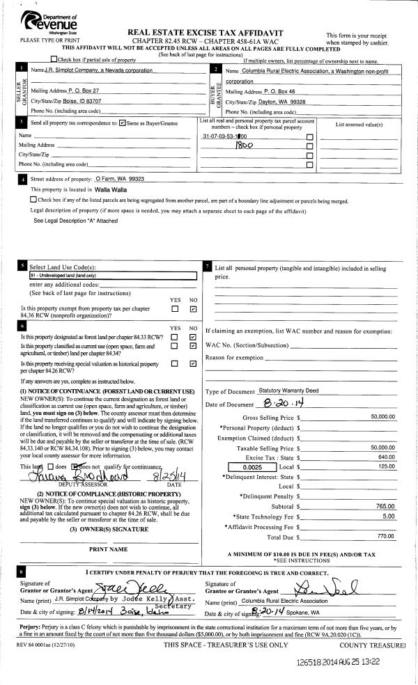 | 1 | 08/25/2014 | WARRANTY D | WARRANTY DEED | JR SIMPLOT | COLUMBIA RURAL ELECTRIC ASSN | | | $50,000.00 | 126518 | 2014-06167 |
