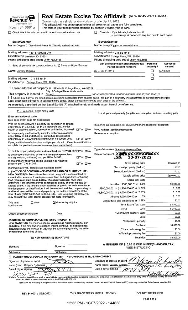 | 2 | 10/07/2022 | SWD | STATUTORY WARRANTY DEED | DIETRICH GREGORY D & SHARON M | WIGGINS JEREMY | | | $300,000.00 | 144833 | 2022-08300 |