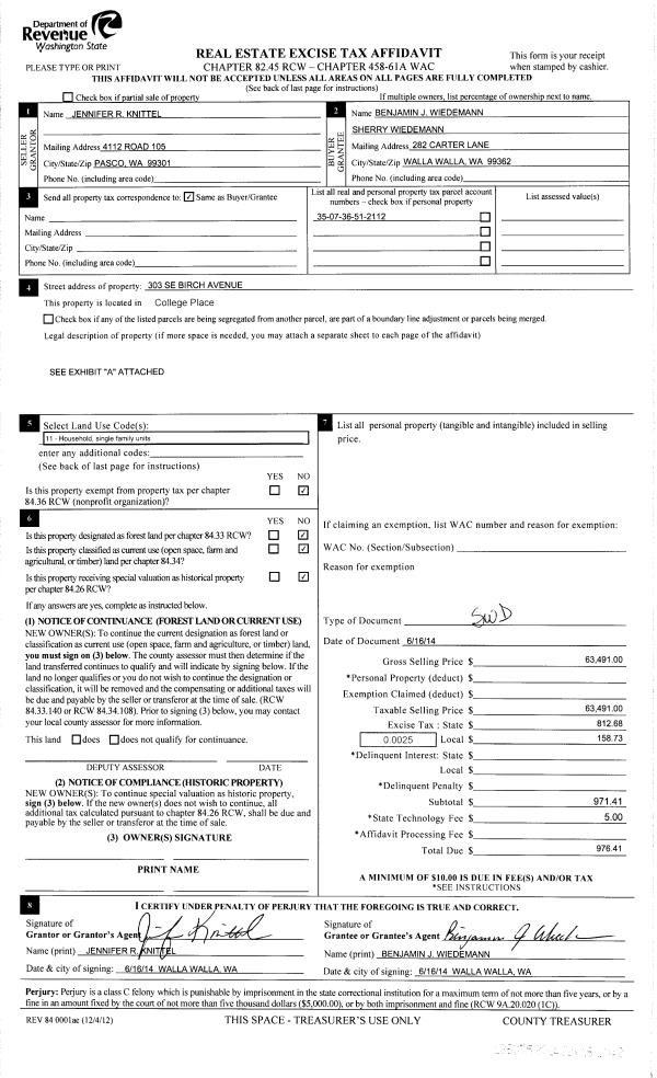 | 1 | 06/16/2014 | SWD | STATUTORY WARRANTY DEED | CHRISTENSEN JENNIFER R | WIEDEMANN BENJAMIN & SHERRY L | | | $63,491.00 | 126075 | 2014-04123 |
