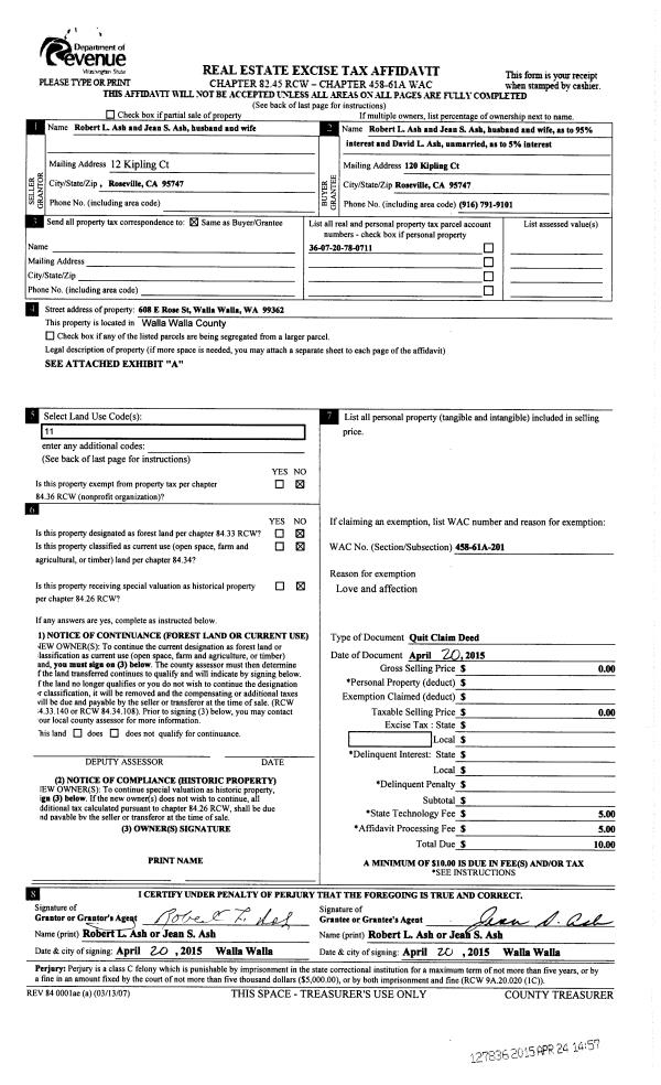 | 7 | 04/24/2015 | QCD | QUIT CLAIM DEED | ASH ROBERT L & JEAN S | ASH ROBERT L & JEAN S AND DAVID L ASH | | | | 127836 | 2015-03345 |