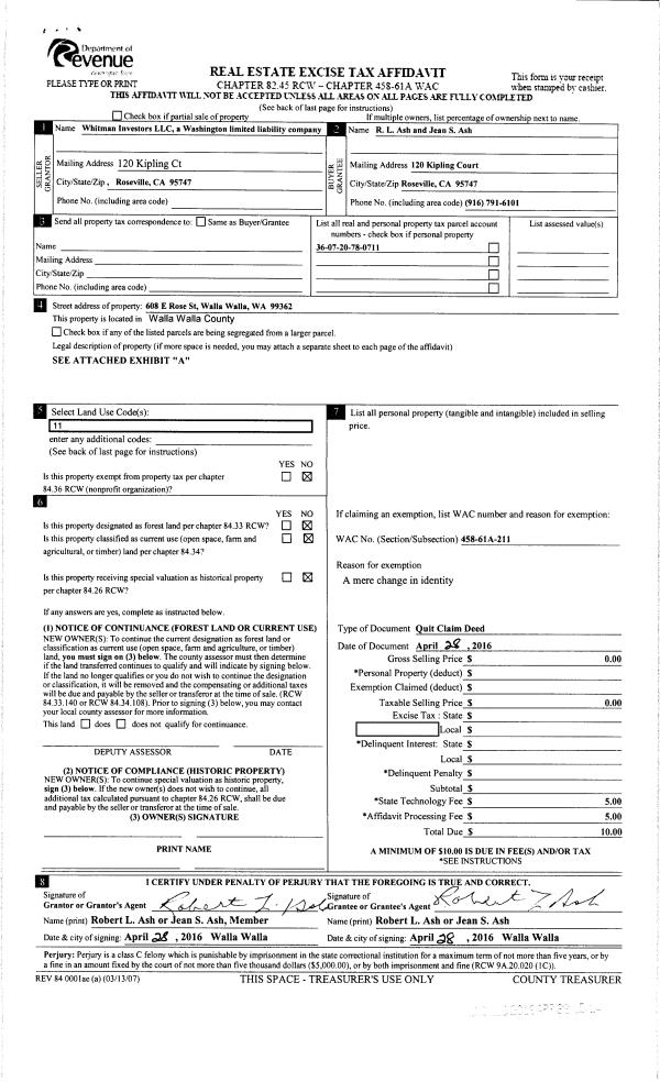 | 6 | 06/26/2015 | QCD | QUIT CLAIM DEED | ASH ROBERT L & JEAN S AND DAVID L ASH | WHITMAN INVESTORS LLC ET AL | | | $0.00 | 128914 | 2015-08596 |