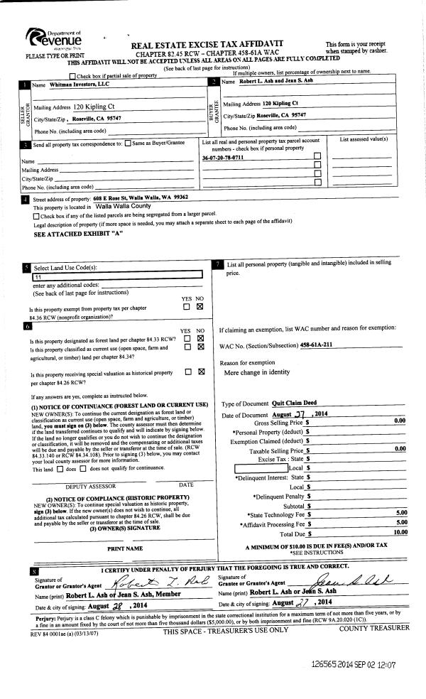 | 6 | 06/26/2015 | QCD | QUIT CLAIM DEED | ASH ROBERT L & JEAN S AND DAVID L ASH | WHITMAN INVESTORS LLC ET AL | | | $0.00 | 128914 | 2015-08596 |