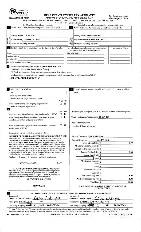| 4 | 05/05/2016 | QCD | QUIT CLAIM DEED | ASH ROBERT L & JEAN S ET AL | ASH ROBERT L & JEAN S | | | | 130177 | 2016-03407 |