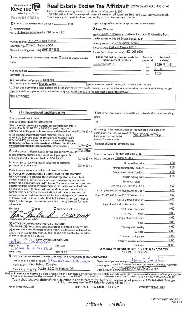 | 1 | 01/17/2025 | BARGAIN & | BARGAIN & SALE DEED | CORNELIUS JO ANN ROBISON | CORNELIUS JOANN R TRUST | | | | 148694 | 2025-00281 |