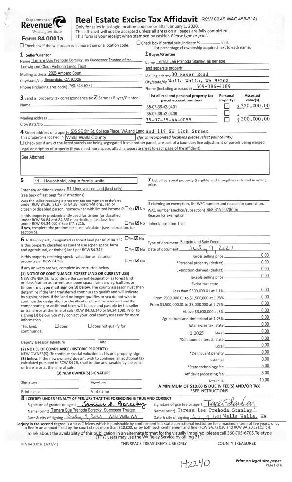 | 2 | 07/09/2021 | BARGAIN & | BARGAIN & SALE DEED | PREHODA LUDWIG & CLARA TRUST | STANLEY TERESA L | | 3 PARCELS | $0.00 | 142240 | 2021-09667 |