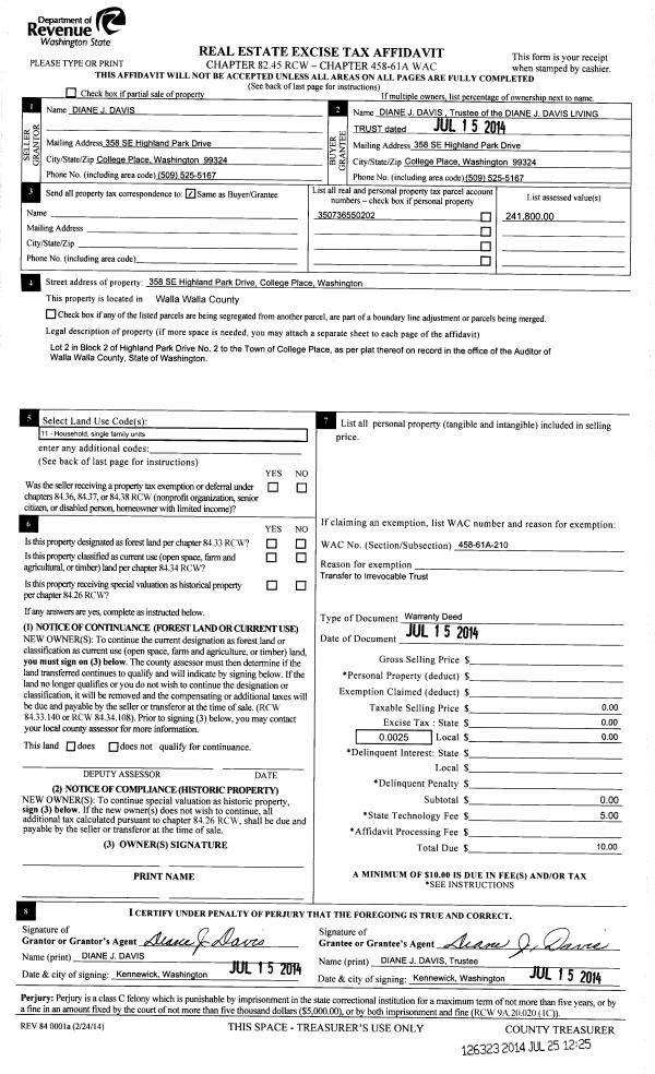 | 1 | 07/25/2014 | WARRANTY D | WARRANTY DEED | DAVIS DIANE J | DIANE J DAVIS LIVING TRUST | | | $0.00 | 126323 | 2014-05267 |