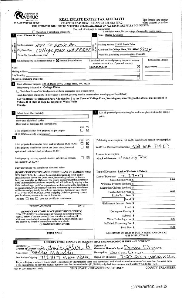| 2 | 07/27/2017 | LOPA | LACK OF PROBATE AFFIDAVIT | ONGERS EDWARD WILLIAM | ONGERS DENISE ELAINE | | | $0.00 | 132890 | 2017-05874 |