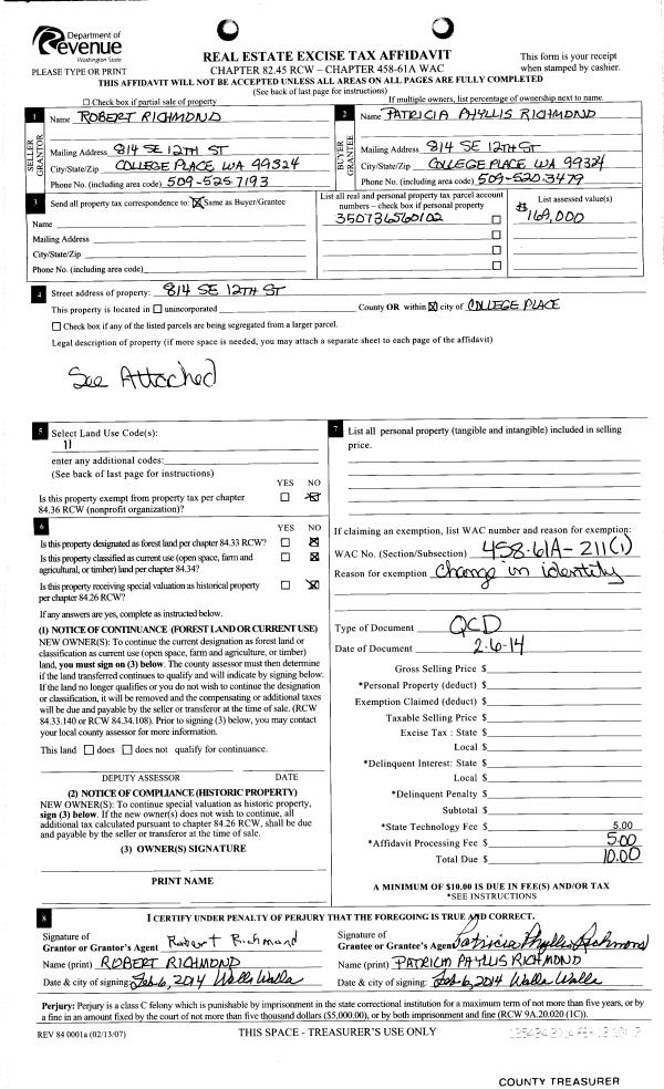 | 1 | 02/12/2014 | QCD | QUIT CLAIM DEED | RICHMOND ROBERT & PATRICIA | RICHMOND PATRICIA PHYLLIS | | | | 125424 | 2014-01050 |