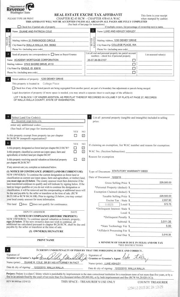 | 2 | 12/24/2015 | SWD | STATUTORY WARRANTY DEED | COLE DUANE R & PATRICIA E | ASHLEY LUKE & ASHLEY | | | $229,500.00 | 129412 | 2015-11037 |