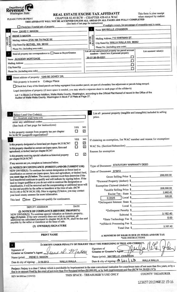 | 2 | 03/22/2013 | WARRANTY D | WARRANTY DEED | MAXON, DAVID Y & IRENE D | JOHANSON, MAYBELLE | | | $208,000.00 | 123657 | 2013-02752 |