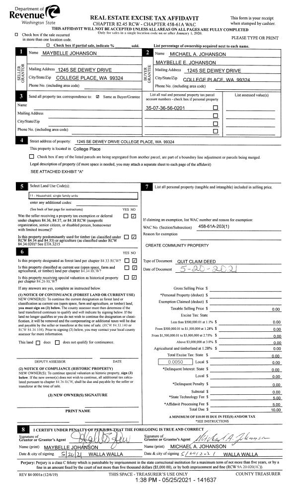 | 1 | 05/20/2021 | QCD | QUIT CLAIM DEED | JOHANSON MAYBELLE | JOHANSON MICHAEL A & MAYBELLE E | | | $0.00 | 141637 | 2021-06317 |
