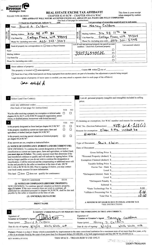 | 1 | 08/12/2019 | QCD | QUIT CLAIM DEED | CALDERA DAVID A & NANCY J | CALDERA NANCY J | | | $0.00 | 137463 | 2019-06009 |