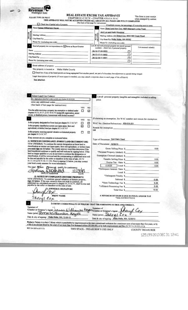 | 6 | 12/31/2013 | QCD | QUIT CLAIM DEED | | COX KEN & SHERYL & H&R MEENACH LIV TRUST & JERRI LYN & KEITH WESTPHAL | | | | 125199 | 2013-12381 |