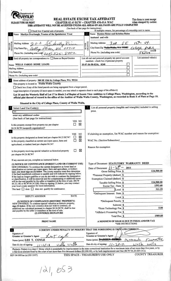 | 3 | 11/29/2011 | WARRANTY D | WARRANTY DEED | OVERBAUGH MARILYN TRUSTEE | REINO DAMIEN & KRISTINA | | | $124,500.00 | 121053 | 2011-09364 |