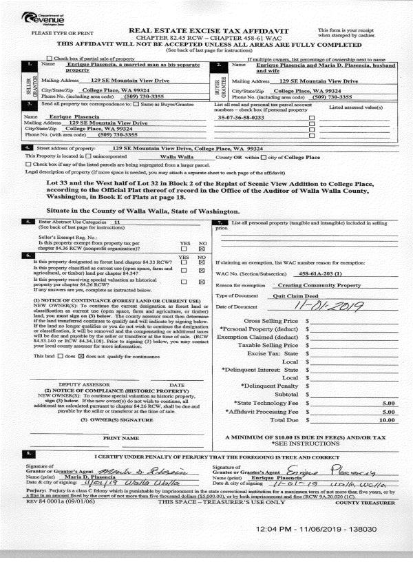 | 1 | 11/01/2019 | QCD | QUIT CLAIM DEED | PLASENCIA ENRIQUE | PLASENCIA ENRIQUE & MARIA D | | | $0.00 | 138030 | 2019-09103 |