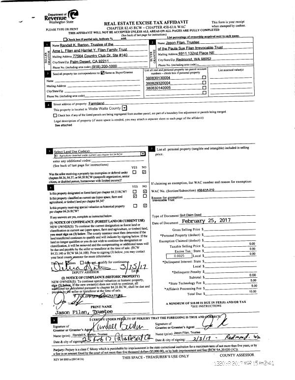 | 3 | 03/15/2017 | QCD | QUIT CLAIM DEED | | FILAN PAULA SUE IRREVOCABLE TRUST | | | | 132038 | 2017-02005 |