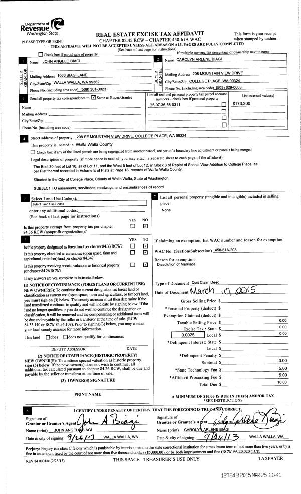 | 1 | 03/10/2015 | QCD | QUIT CLAIM DEED | BIAGI JOHN & CAROLYN | BIAGI CAROLYN ARLENE | | | $0.00 | 127648 | 2015-02425 |