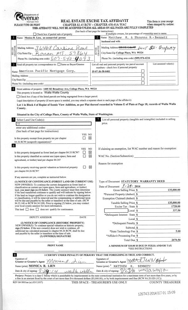 | 1 | 09/29/2014 | SWD | STATUTORY WARRANTY DEED | LIEN MONICA R | BENNETT MATTHEW R & SHAUNNA R | | | $135,000.00 | 126743 | 2014-07198 |