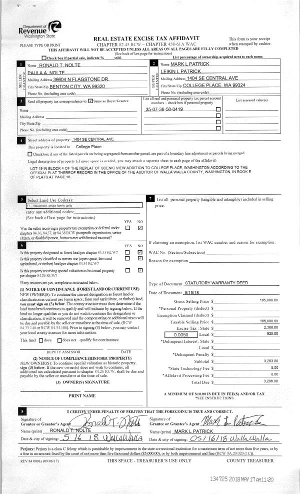| 1 | 05/17/2018 | SWD | STATUTORY WARRANTY DEED | NOLTE RONALD T & PAULA A | PATRICK MARK L & LEIKIN L | | | $185,000.00 | 134725 | 2018-03882 |