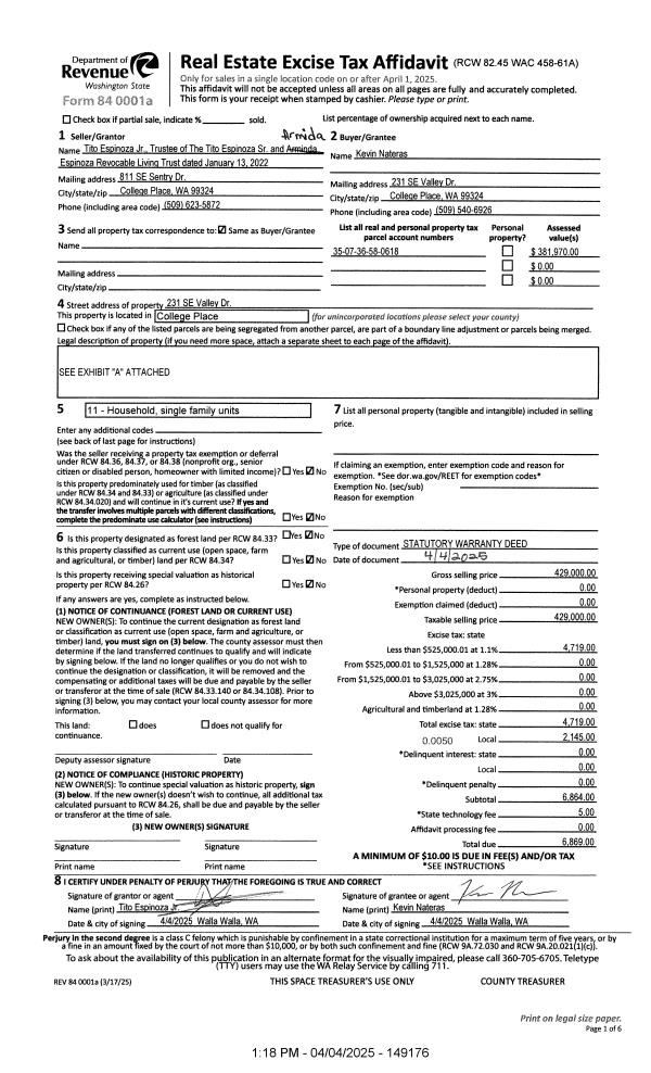 | 1 | 04/04/2025 | SWD | STATUTORY WARRANTY DEED | TITO ESPINOZA SR & ARMIDA ESPINOZA REV LIVING TRUST | NATERAS KEVIN | | | $429,000.00 | 149176 | 2025-01782 |