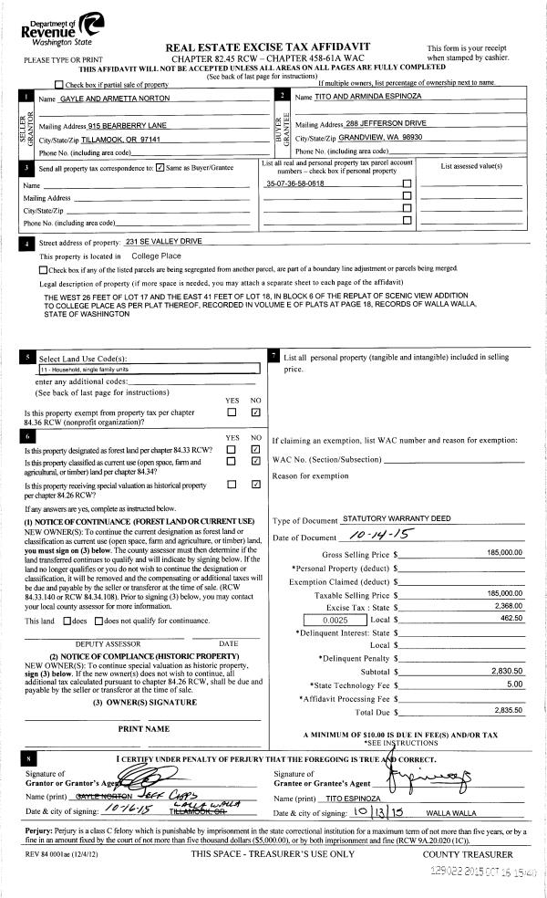 | 4 | 10/16/2015 | SWD | STATUTORY WARRANTY DEED | NORTON GAYLE & ARMETTA | ESPINOZA TITO ESTATE OF & ARMIDA | | | $185,000.00 | 129022 | 2015-09088 |
