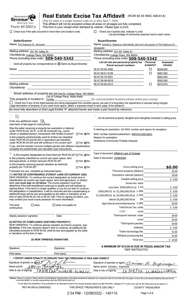 | 3 | 12/08/2022 | LOPA | LACK OF PROBATE AFFIDAVIT | ESPINOZA TITO ESTATE OF & ARMIDA | ESPINOZA ARMIDA L | | 5-PARCELS | $0.00 | 145110 | 2022-09581 |