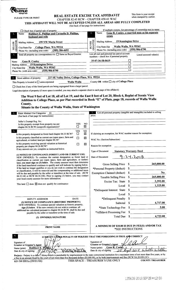 | 6 | 09/28/2018 | SWD | STATUTORY WARRANTY DEED | PHILLIPS HOLLIBERT E | CONLEY GENE RAYMOND | | | $265,000.00 | 135638 | 2018-08099 |