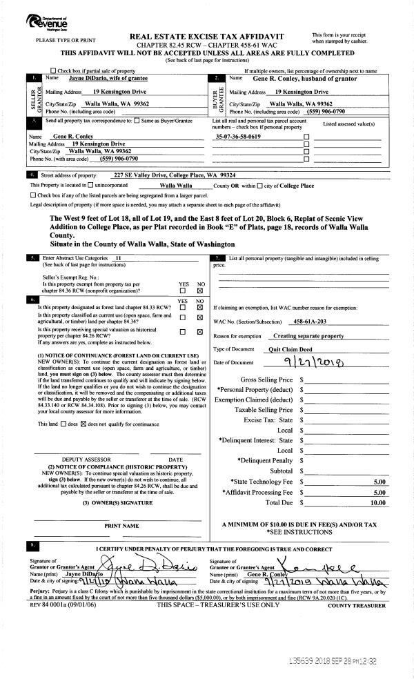 | 5 | 09/28/2018 | QCD | QUIT CLAIM DEED | DIDARIO JAYNE E | CONLEY GENE RAYMOND | | | | 135639 | 2018-08100 |