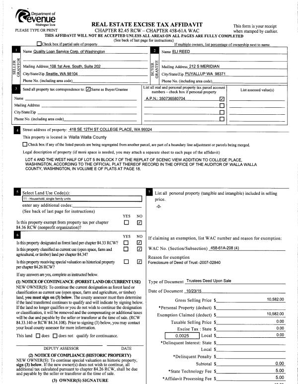 | 6 | 10/29/2015 | TRUSTEES D | TRUSTEE'S DEED | DIAZ TIM & REGINA | REED ELI | | | $10,582.00 | 129097 | 2015-09481 |