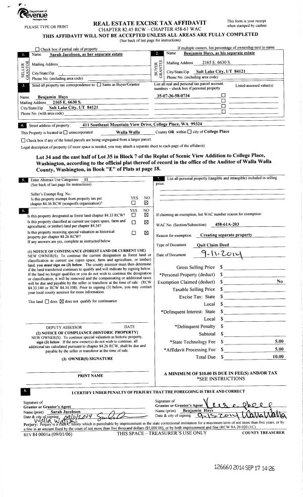| 1 | 09/11/2014 | QCD | QUIT CLAIM DEED | HAYS BENJAMIN | HAYS BENJAMIN | | | | 126660 | 2014-06811 |