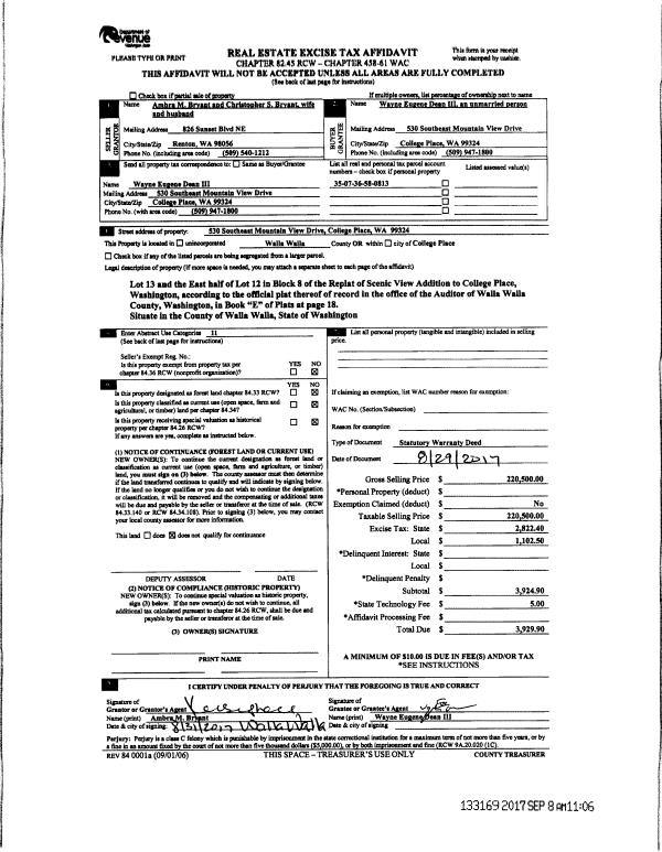 | 3 | 09/08/2017 | SWD | STATUTORY WARRANTY DEED | BRYANT CHRISTOPHER S & AMBRA M | DEAN WAYNE EUGENE III | | | $220,500.00 | 133169 | 2017-07049 |