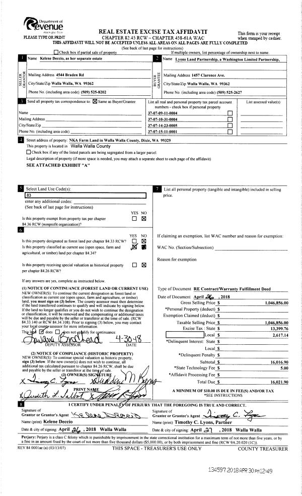 | 1 | 09/17/2024 | FUL | FULFILLMENT DEED | DECCIO KELENE | LYONS LAND PARTNERSHIP | | | | 134597 | 2024-05300 |