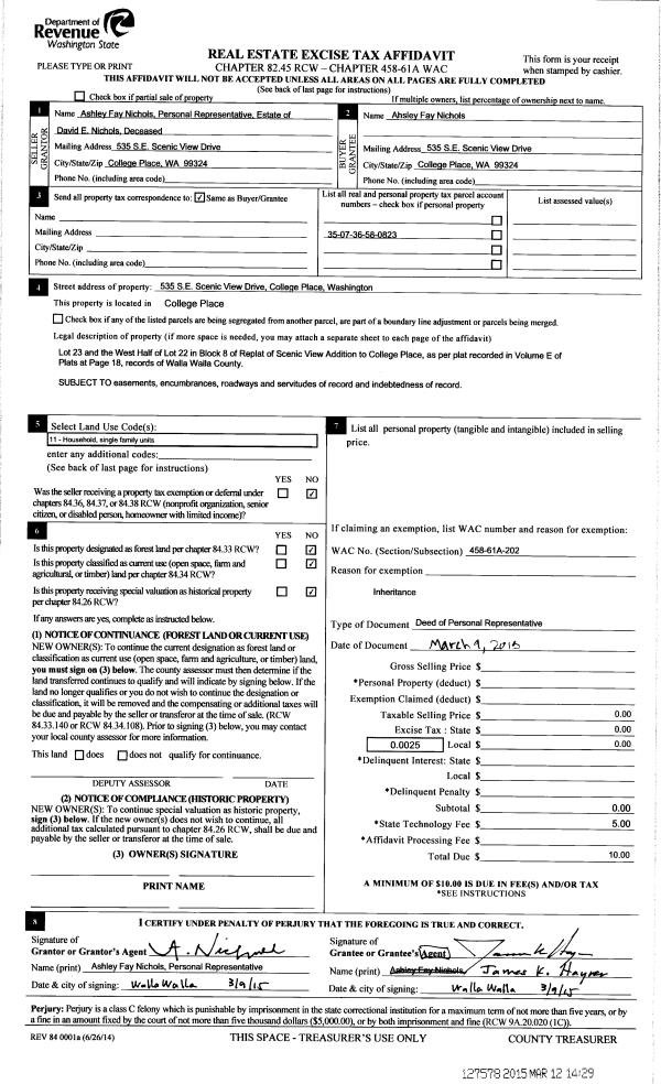 | 1 | 03/09/2015 | DPR | DEED OF PERSONAL REPRESENTATIVE | NICHOLS DAVID E | NICHOLS ASHLEY FAY | | | $0.00 | 127578 | 2015-02096 |