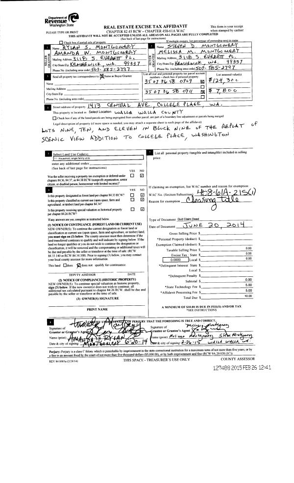 | 2 | 06/20/2014 | QCD | QUIT CLAIM DEED | MONTGOMERY STEVEN D | MONTGOMERY STEVEN D & MELISSA M | 2 PARCELS | | $0.00 | 127488 | 2015-01695 |