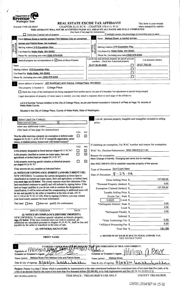 | 3 | 08/23/2014 | QCD | QUIT CLAIM DEED | COLE MELISSA | BOWE MELISSA | | | $0.00 | 126581 | 2014-06508 |