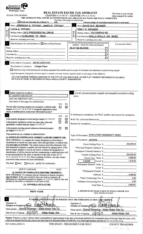 | 1 | 10/15/2019 | SWD | STATUTORY WARRANTY DEED | TIFFANY JEREMIAH G | BEAMER DAVID M & EMILY N | | | $202,000.00 | 137874 | 2019-08281 |