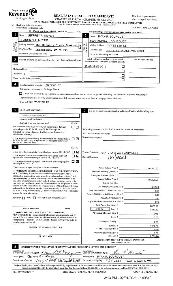 | 1 | 02/01/2021 | SWD | STATUTORY WARRANTY DEED | MEYER JEFFREY R & SHARON S L | BOURGUET RYAN P & CASSANDRA L | | 2 PARCLES | $397,500.00 | 140840 | 2021-01240 |