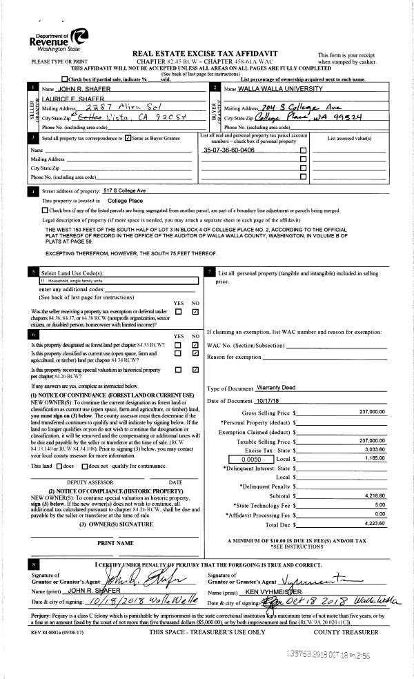 | 1 | 10/18/2018 | WARRANTY D | WARRANTY DEED | SHAFER JOHN R & LAURICE E | WALLA WALLA UNIVERSITY | | | $237,000.00 | 135763 | 2018-08645 |